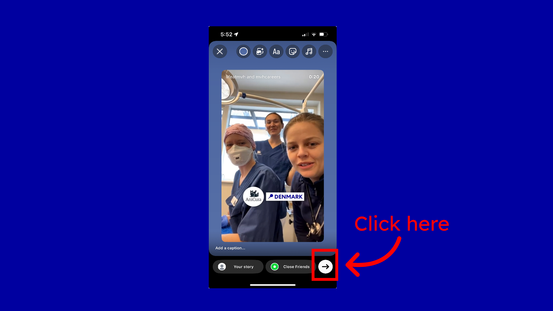 You will then see the post in your story editor mode. Here you can add music, text, stickers, and more. We recommend playing around with features once you want to become a more active user. Once your post loads, click the white arrow.