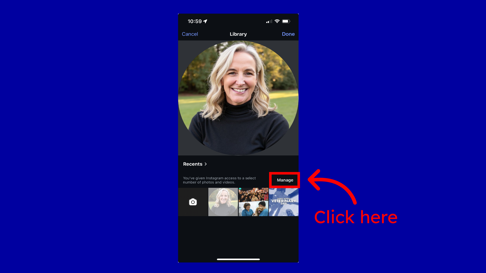 Now you're in Instagram's photo library. Click manage if Instagram doesn't have access to your camera roll. This will allow you to select which photos you want the app to have access to.
